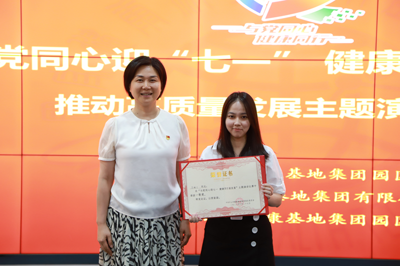 健康基地集團(tuán)園區(qū)黨委書(shū)記、總經(jīng)理萬(wàn)鶴群為優(yōu)秀獎(jiǎng)獲得者劉婉思(投資部)、郭培鑫(工程部)、楊卓星(經(jīng)濟(jì)發(fā)展部)、劉賢進(jìn)(招商二部)頒獎(jiǎng)