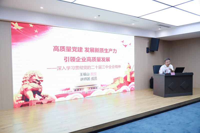 宣講會邀請中山市委宣講團(tuán)成員、習(xí)近平法治思想宣講團(tuán)成員、電子科技大學(xué)中山學(xué)院教授王福山作題為《高質(zhì)量黨建 發(fā)展新質(zhì)生產(chǎn)力 引領(lǐng)企業(yè)高質(zhì)量發(fā)展》專題輔導(dǎo)。王教授從深刻認(rèn)識黨的二十屆三中全會的歷史意義、黨的二十屆三中全會議題和客觀需要、關(guān)于決定稿基本框架及特點(diǎn)、深化黨的建設(shè)制度改革、以高質(zhì)量黨建引領(lǐng)國企高質(zhì)量發(fā)展、找準(zhǔn)路徑加快培育發(fā)展新質(zhì)生產(chǎn)力等方面,對黨的二十屆三中全會精神作全面系統(tǒng)的闡釋,并深入剖析《中共中央關(guān)于進(jìn)一步全面深化改革、推進(jìn)中國式現(xiàn)代化的決定》。宣講站位高遠(yuǎn)、內(nèi)容豐富,尤其對《決定》中涉及國資國企改革的重要內(nèi)容作了深刻解讀,對全體黨員干部全面理解和準(zhǔn)確把握黨的二十屆三中全會精神的豐富內(nèi)涵、實質(zhì)要義具有指導(dǎo)意義。