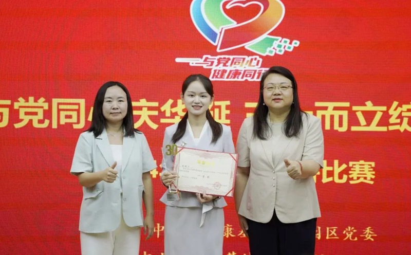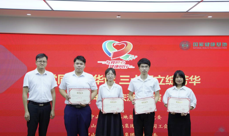 中山港街道團(tuán)工委書記高穎與健康基地集團(tuán)園區(qū)黨委書記、總經(jīng)理萬(wàn)鶴群為一等獎(jiǎng)獲得者胡雅文(行政部)頒獎(jiǎng)