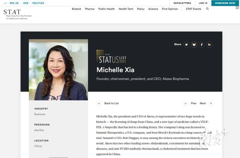 近日,國際著名生物醫(yī)藥行業(yè)媒體STAT發(fā)布了全球生命科學領域《The 2025 STATUS List》(2025年領軍人物榜單)。該榜單從全球醫(yī)療政策、生物技術(shù)、衛(wèi)生技術(shù)、醫(yī)學和衛(wèi)生保健等領域,遴選了對塑造健康與生命科學未來全球最具有影響力的50位領軍人物。健康基地園區(qū)企業(yè)康方生物創(chuàng)始人、董事長、總裁兼首席執(zhí)行官夏瑜入選,成為唯一獲此殊榮的亞洲企業(yè)CEO。