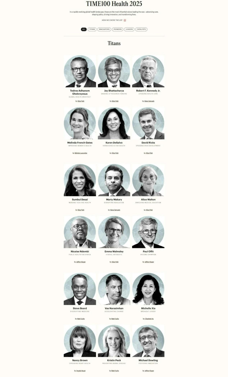 TIME100 HEALTH 2025由《時代雜志》資深編輯團隊與全球醫(yī)學專家歷時數月調研產生,入選者均為推動世界健康事業(yè)發(fā)展的變革型人物,包括政界、學界、產業(yè)界和投資界的領袖,彰顯了其對行業(yè)乃至全球公共衛(wèi)生格局的深遠影響力。入選者包括美國衛(wèi)生與公眾服務部新任部長、美國FDA 新任局長、GSK CEO、諾華CEO、禮來CEO、斯隆—凱特林癌癥研究中心主任、英國凱特王妃等。
