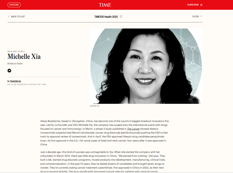 5月8日,美國《時代》(TIME)雜志公布了2025年全球“醫(yī)療健康最具影響力100位人物”(TIME100 Most Influential People in Health of 2025)榜單。健康基地園區(qū)企業(yè)康方生物創(chuàng)始人、董事長、總裁兼首席執(zhí)行官夏瑜博士憑借其對全球生命科學領域發(fā)展的貢獻,及其所領導的康方生物在生物藥物創(chuàng)新開發(fā)領域取得的卓越成就入選該榜單,并被選入此次榜單的“Titans”(泰坦)系列人物。