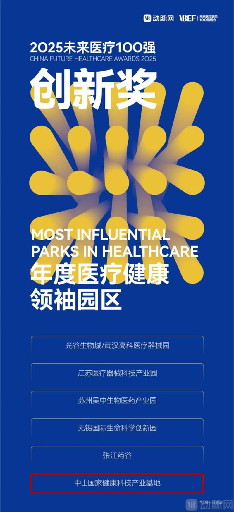 創(chuàng)立于2015年的未來醫(yī)療100強(qiáng)榜單是由VB100、動(dòng)脈網(wǎng)、蛋殼研究院推出的國內(nèi)第一個(gè)針對非上市企業(yè)的創(chuàng)新醫(yī)療領(lǐng)域榜單,致力于發(fā)現(xiàn)和推動(dòng)中國醫(yī)療健康產(chǎn)業(yè)的創(chuàng)新變革。其中,“年度醫(yī)療健康領(lǐng)袖園區(qū)”評選維度為綜合影響力、服務(wù)生態(tài)構(gòu)建能力、持續(xù)創(chuàng)新能力,要求入選產(chǎn)業(yè)園滿足以下要求:
