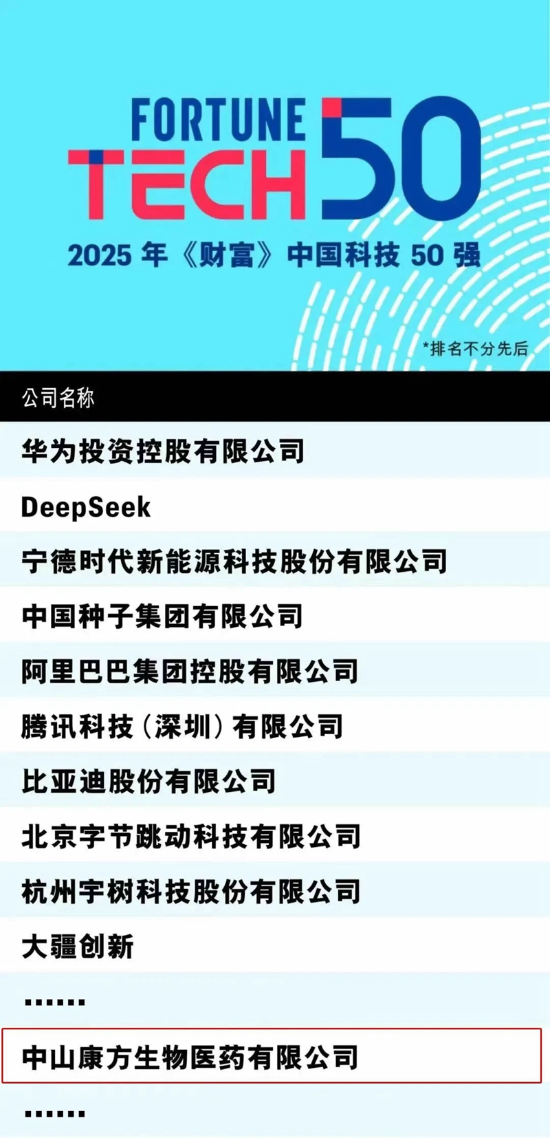 8月21日,國際權(quán)威商業(yè)雜志《財富》(Fortune)正式公布“2025年《財富》中國科技50強”榜單結(jié)果,健康基地園區(qū)企業(yè)康方生物憑借卓越的創(chuàng)新能力與突破性研發(fā)成果,成功入選 “中國科技50強”榜單。